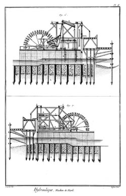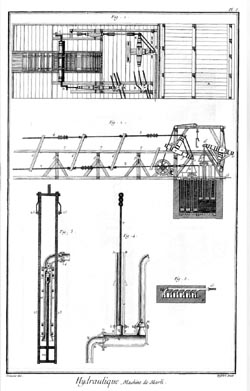 Comme on trouvera dans l'ouvrage une explication détaillée de cette fameuse machine, nous nous contenterons d'en parcourir les principales parties. Il y a 14 roues. Ce que nous allons dire d'une convient à toutes. Cette roue sert à porter l'eau depuis la riviere de Seine jusqu'à l'aqueduc. Son mouvement a deux effets. L'un de faire agir des pompes aspirantes & refoulantes qui portent l'eau à 150 pieds de hauteur dans un premier puisard éloigné de la riviere de 100 toises. L'autre est de mettre en mouvement les balanciers qui font agir les pompes refoulantes placées dans les deux puisards. Celles qui répondent au premier puisard, reprennent l'eau & la portent au second élevé au-dessus du premier de 175 pieds, & éloigné de la riviere de 324 toises. Au second puisard d'autres pompes la refoulent jusque sur la plate-forme d'une tour élevée au-dessus d'un puisard de 177 pieds, & éloigné de la riviere de 614 toises. L'eau parvenue à cette hauteur coule sur un aqueduc de 230 toises de long, percé de 36 arcades, jusqu'auprès de la grille du château de Marly, d'où elle descend dans des réservoirs qui la distribuent au jardin. | |||||||