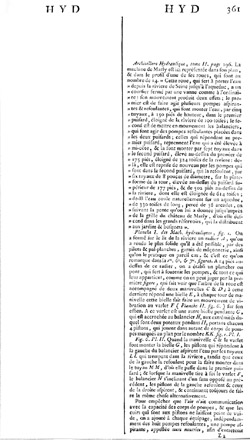 | Planche I. des Mach. hydrauliques, fig. 1. On a formé sur le lit de la riviere un radier A, qu'on a rendu le plus solide qu'il a été possible, par des pilots & pal - planches, garnis de mâçonnerie, ainsi qu'on le pratique en pareil cas, & c'est ce qu'on remarque dans la 1re. 6e. & 7e. figures. A 14 piés au dessus de ce radier, on a établi un plancher ou pont, qui sert à soutenir les pompes, & tout ce qui leur appartient, comme on en peut juger par la premiere figure, qui fait voir que l'arbre de la roue est accompagné de deux manivelles C & D; à cette derniere répond une bielle E, à chaque tour de manivelle cette bielle fait faire un mouvement de vibration au varlet F (Planche II. fig. 6.) sur son essieu. A ce varlet est une autre bielle pendante G, qui est accrochée au balancier H, aux extrémités duquel sont deux poteaux pendans II, portans chacun 4 pistons, qui jouent dans autant de corps de pompes marqués au plan par le nombre KK. fig. 1. Pl. I. Fig. 6. Pl. II. Quand la manivelle C & le varlet font monter la bielle G, les pistons qui répondent à la gauche du balancier aspirent l'eau par les tuyaux L L qui trempent dans la riviere, tandis que ceux de la gauche la refoulent pour la faire monter dans le tuyau M M, d'où elle passe dans le premier puisard; & lorsque la manivelle tire à soi le varlet F, le balancier H s'inclinant d'un sens opposé au précédent, les pistons de la gauche refoulent & ceux de la droite aspirent, & continuent toûjours de faire la même chose alternativement. Pour empêcher que l'air n'ait communication avec la capacité des corps de pompes, & que les cuirs qui sont aux pistons ne laissent point de vuide, on a ajouté à chaque équipage, indépendamment des huit pompes refoulantes, une pompe aspirante, appellée mere nourrice, afin d'entretenir [p. 362] toûjours de l'eau dans un bassin N, élevé à peu près à la hauteur du bord des corps de pompes; ainsi il y a un des poteaux pendans I, qui porte un cinquieme piston. La manivelle D (Pl. II. fig. 7.) donne le mouvement aux pompes du premier & du second puisard; & pour juger comme cela se fait, il faut considérer la troisieme figure, relativement à la seconde, du sens qui leur convient; on y verra que cette manivelle fait faire un mouvement de vibration au varlet O, par le moyen de la bielle P qui tire à soi, & pousse en avant l'extrémité Q. Ce varlet en fait agir deux autres, horisontalement placés au dessous des nombres R & S, par le mouvement qui leur est communiqué de la part des bielles T & U, qui poussent ou qui tirent à elles le varlet supérieur ou inférieur, selon la situation de la manivelle. Pl. I. fig. 1. L'on voit sur le plan comme le varlet X peut se mouvoir sur son axe Y, & qu'à l'extrémité Z il y a une chaîne I, qu'on doit regarder comme faisant partie de la chaîne 2 & 3 exprimée dans la 2. fig. Pl. I. de même le varlet R (fig. 7. Pl. II.), qu'on ne peut voir sur le plan, mais qui est tout semblable à l'inférieur, répond aussi à une chaîne qui fait partie de l'autre 4 & 5; ainsi ces deux chaînes sont tirées alternativement par les varlets R & S, pour faire agir les pompes des puisards, fig. 2. Pl. I. pour les entretenir, on les a soutenus avec les balanciers 6, posés de 18 piés en 18 piés; ces balanciers sont traversés par un boulon, qui appuie sur le cours de lice 7, posé sur les chevalets 8. La figure 2. Pl. I. est un profil qui peut être commun au premier & au second puisard, mais qui doit plûtôt appartenir au second qu'au premier, parce que les chaînes vont aboutir aux varlets 9 & 10, au lieu qu'elles traversent le premier, après y avoir mis en mouvement les pompes qui y sont. Fig. 2. Pl. I. Lorsque la chaîne 4 & 5 tire à soi, de la droite à la gauche, le varlet 9, ce varlet enleve le chassis 11 suspendu à l'extrémité 12, ayant trois cadres 13, portans les pistons qui refoulent l'eau dans les corps de pompes 14 & 15. Quand cette chaîne cesse d'être tendue, & que l'inférieure 2 & 3 est tirée, alors le poids du chassis 11, celui des cadres & des pistons, fait baisser l'extrémité 12 du varlet 9, & l'eau monte dans les trois corps de pompes de cet équipage; d'autre part, l'extrémité 16 du varlet 10 enleve le chassi 17, & les pistons que soutiennent les cadres 18, refoulent l'eau dans les trois corps de pompes de ce second équipage, qui sont unis comme les précédens aux tuyaux 14 & 15. Tous ces corps de pompes, au nombre de 257, sont soutenus inébranlables, par des barres de fer qui les embrassent, comme on le peut voir au plan du puisard, fig. 5. Pl. I. Fig. 3. Pl. I. On voit plus en grand l'intérieur d'une des pompes refoulantes du premier & du second puisard; chaque corps de pompe 19, y est porté par des liens de fer 20; & d'autres 21, empêchent que ce corps de pompe ne soit enlevé par le piston dans le tems qu'il refoule: on voit aussi que la tige 22, qui porte le piston, est attachée à deux entretoises du chassis 23, que ce cadre & le piston haussent & baissent ensemble; il y a deux clapets aux endroits 24, & des rouletres en 25, qui servent à soulager la manoeuvre lorsqu'on veut ôter ou remettre un cadre ou chassis. Fig. 4. Pl. I. Cette figure est l'intérieur d'une des pompes de la riviere; c'est un tuyau de communication HGEFIL fondu d'une seule piece, dont l'un des bouts G H est uni par une bride avec un tuyau d'aspiration N O qui trempe dans l'eau, & où il y a un clapet P; l'autre bout L M K, qui est fait en retour d'équerre, aboutit au tuyau montant M K S, qui porte l'eau sur la montagne, au premier puisard, en ouvrant son clapet R. Dans le milieu est une branche C D E F, liée par une bride avec le corps de pompe A B C D, dans lequel agit le piston Q, parfaitement cylindrique & massif, traversé par la tige T V suspendue à une bielle pendante qui lui donne le mouvement, & refoule l'eau dans le tuyau S en ouvrant le clapet R, & successivement se rend dans le lieu destiné. Les pompes que la manivel